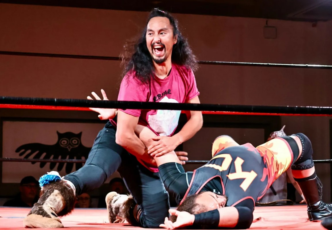 Noler Bear bests Mighty KC during a wrestling match in Yellowknife on October 23, 2024.